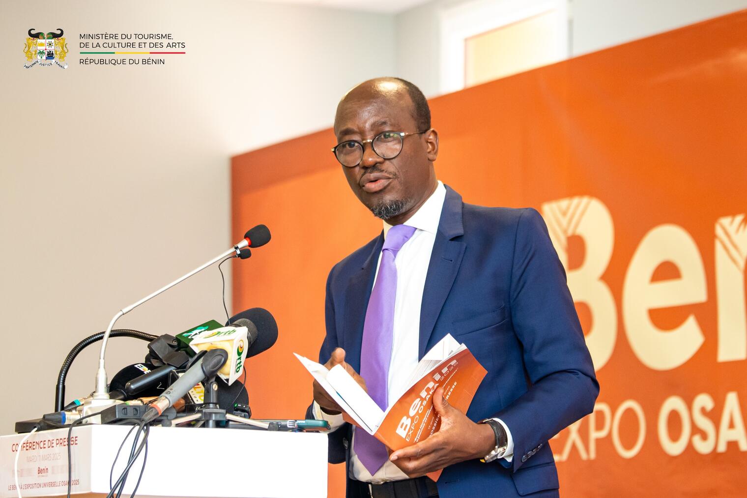 L’annonce a été faite par le Ministre du Tourisme, de la Culture et des Arts, Monsieur Jean-Michel H. ABIMBOLA, lors d’une conférence de presse tenue ce 11 mars 2025. Occasion pour lui de mettre en avant l’ambition du Bénin de se positionner comme une destination culturelle et économique de premier plan. C’était en présence des représentants des Ministères et Agences de l’État (MEF, MAE, MTCA, MIC, Bénin Tourisme, ADAC, SIPI, SoLE, ADSC, ADPME, EPA) impliqués dans l’organisation ainsi que des Commissaires Généraux et des membres de la direction du Pavillon du Bénin.