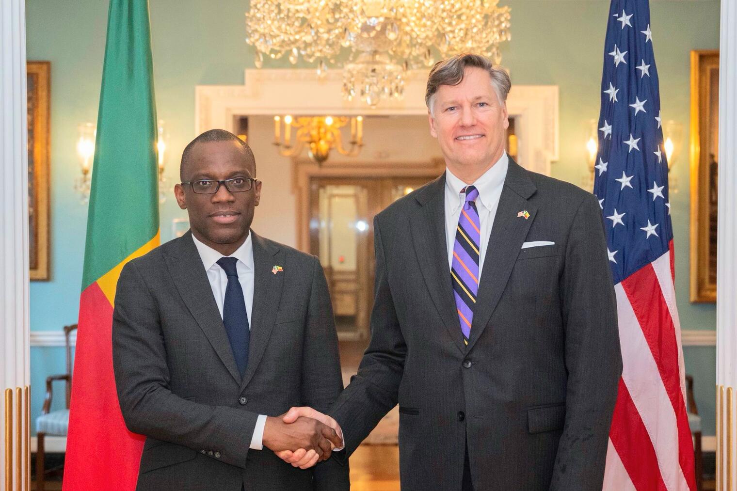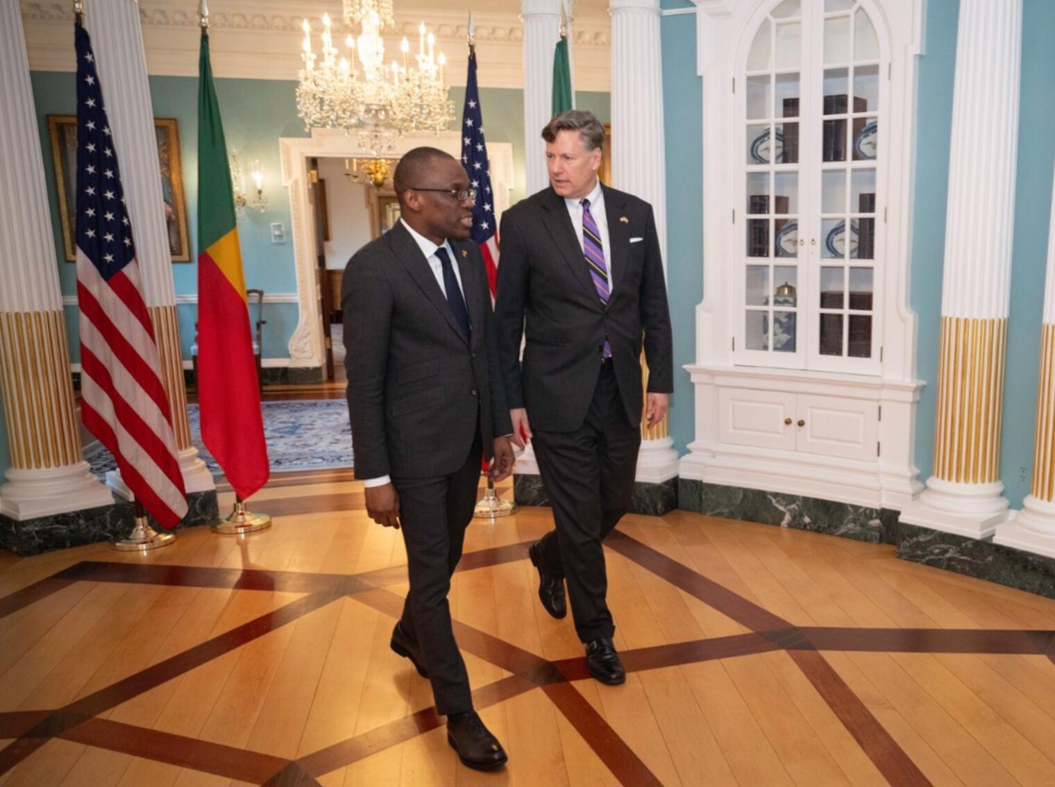 Le Ministre des Affaires étrangères, Monsieur Olushegun ADJADI BAKARI a d’abord été reçu par le Secrétaire d’État adjoint, Monsieur Christopher LANDAU. Les deux personnalités ont salué la qualité constante du dialogue politique entre le Bénin et les États-Unis, fondé sur la confiance mutuelle, le respect des institutions démocratiques et un engagement partagé en faveur de la stabilité régionale.