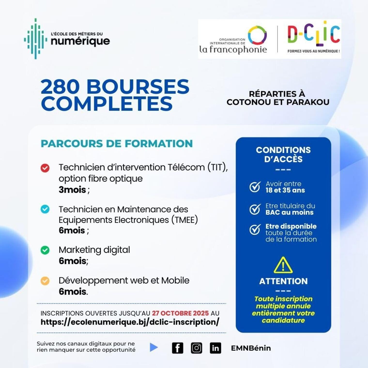 Inscriptions sur =>https://ecolenumerique.bj/dclic-inscription/